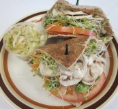 Veggie Pita with Hummus, Shredded Mozzarella Cheese, Cucumber, Tomato, Mushrooms and Sprouts served in a Whole Wheat or White Pita - $7.99