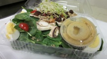 Spinach Salad - Spinach with Egg, Bacon, Mushroom, Tomato, Sunflower Seeds, Raisins, and Sprouts, topped with Honey Mustard Dressing - $9.99